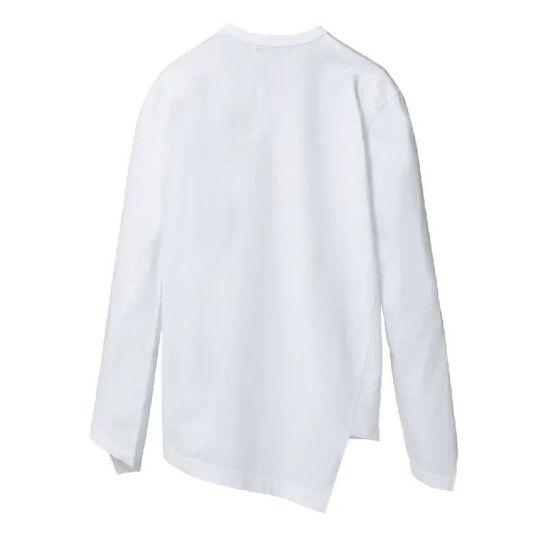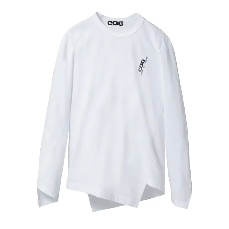 This CDG Bias Long Sleeve Shirt in white by Comme des Garcons presents a fresh and stylish appearance suited for daily wear. It’s a relaxed pullover design. The CDG logo emblem on the chest brings a distinctive designer accent. It matches well with denim, joggers, or sneakers, making it a smart choice for laid-back outfits and modern streetwear looks.
