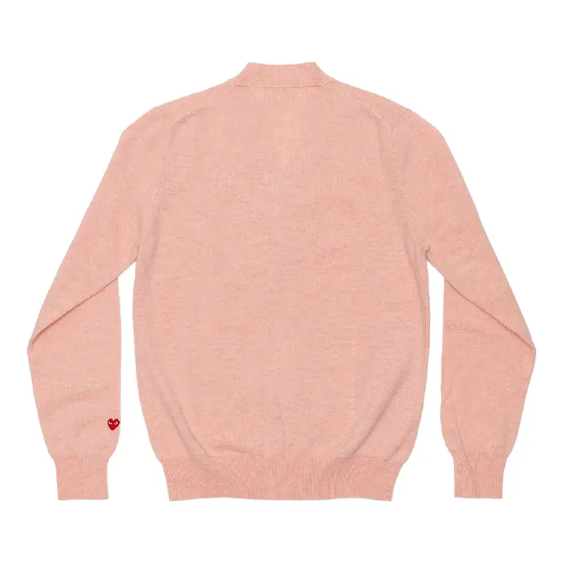 The PLAY CDG V-Neck Cardigan in Light Pink by Comme des Garcons features a clean and timeless design with a classic V-neck and button down front. The long sleeves and smooth finish create a neat, balanced look, while the white heart logo on the chest adds a subtle yet instantly recognizable designer touch. Easy to style and comfortable for everyday wear, this cardigan delivers a refined and modern look.