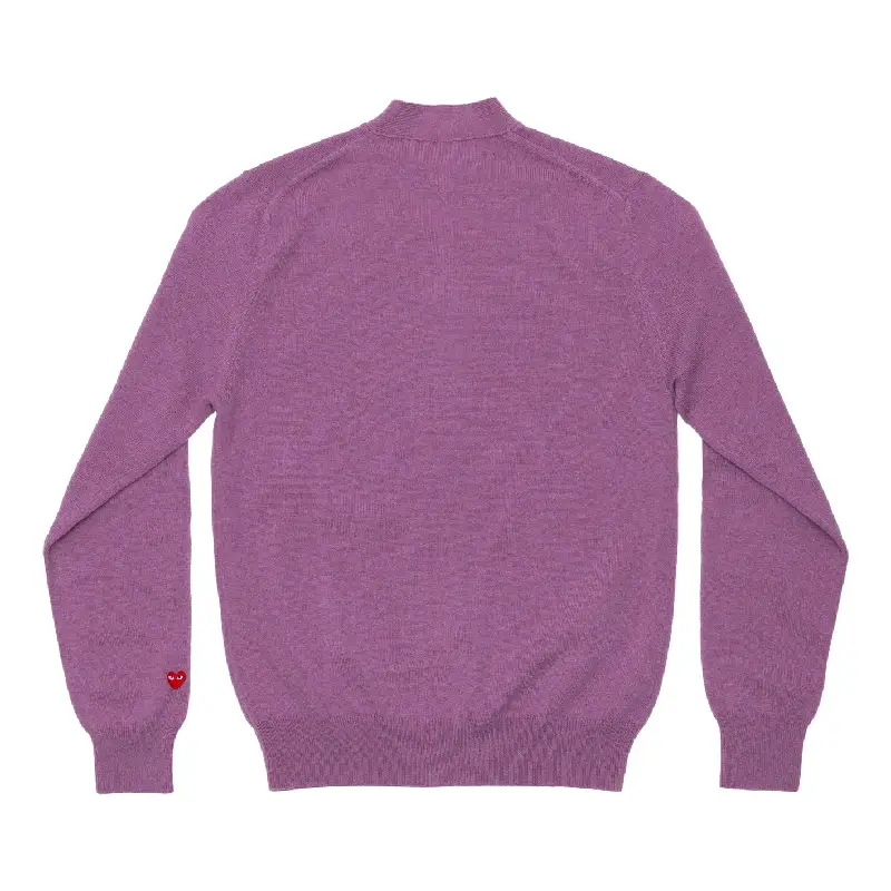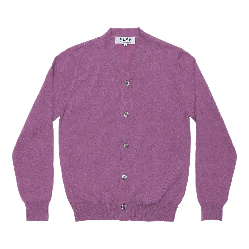 The PLAY CDG V-Neck Cardigan Pastel Series Sleeve Heart – Purple by  Comme des Garcons features a clean and timeless design with a classic V-neckline and button-down front. Designed with long sleeves and a smooth, structured finish, it delivers a neat and balanced appearance. The white heart logo on the chest adds a subtle yet instantly recognizable designer touch. Easy to style and suitable for everyday wear, this cardigan offers a refined and modern look.